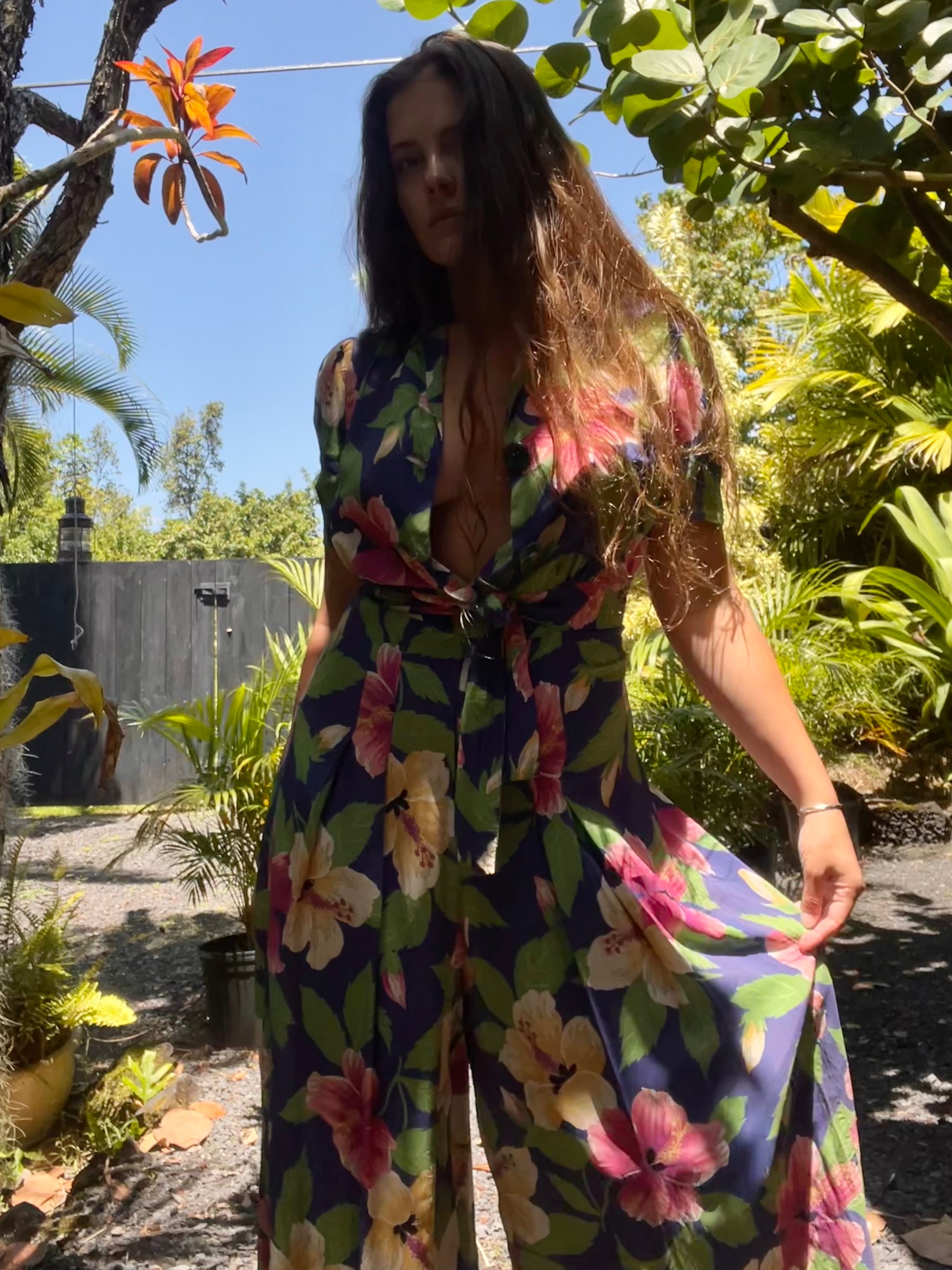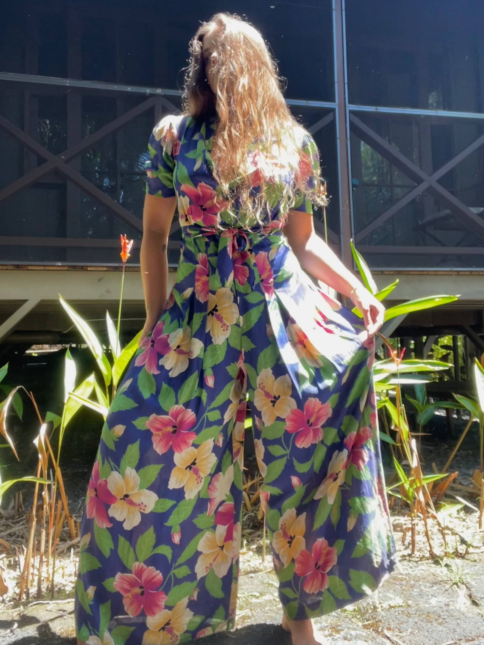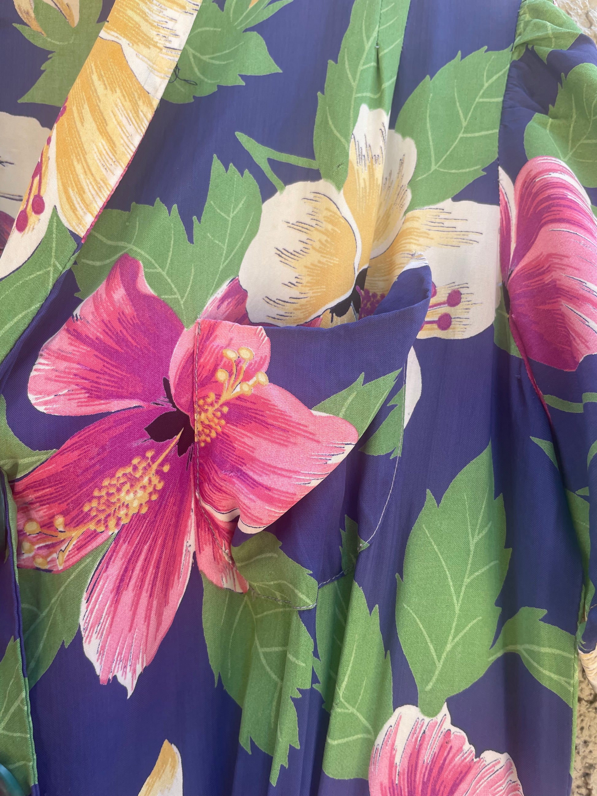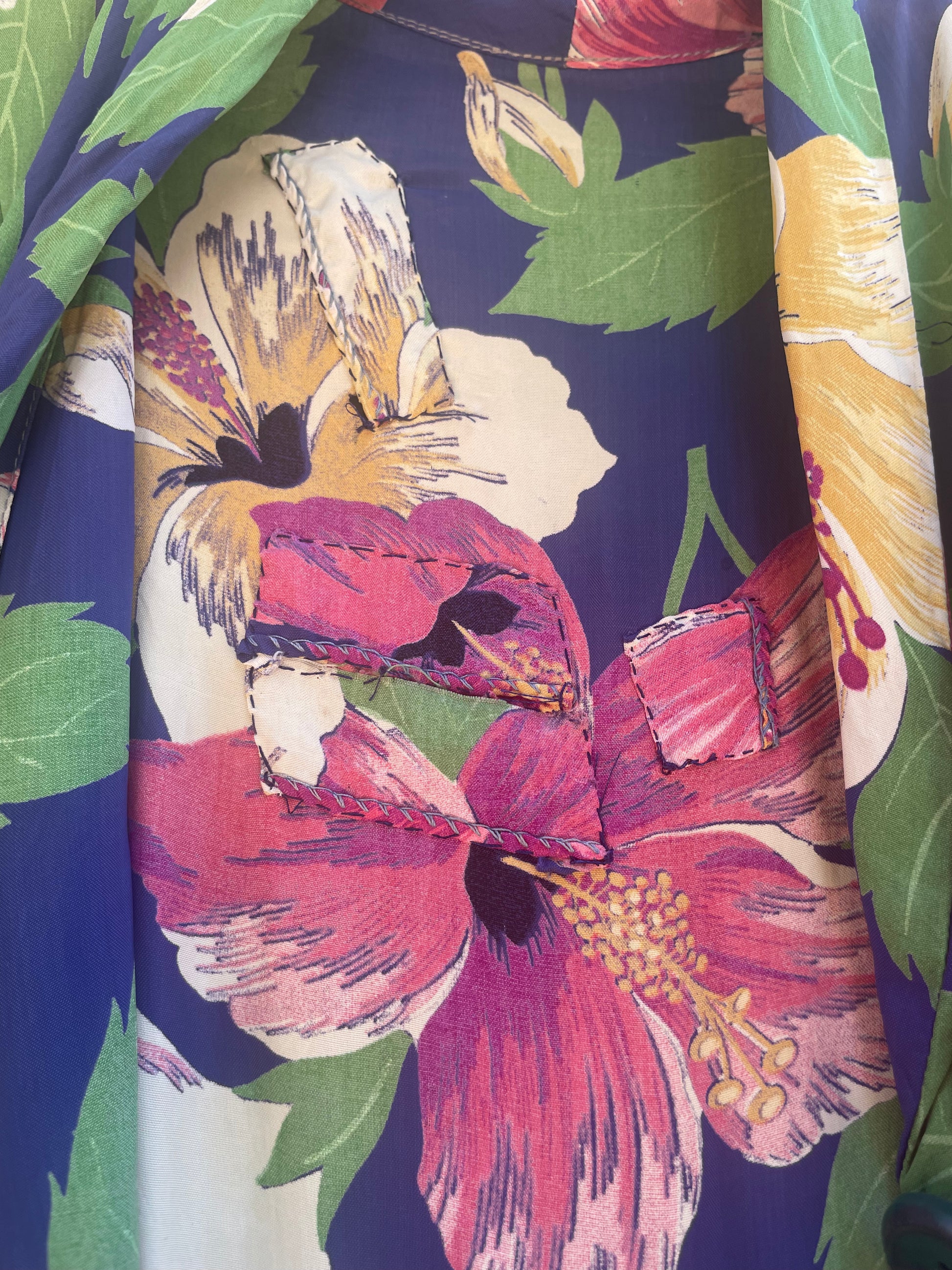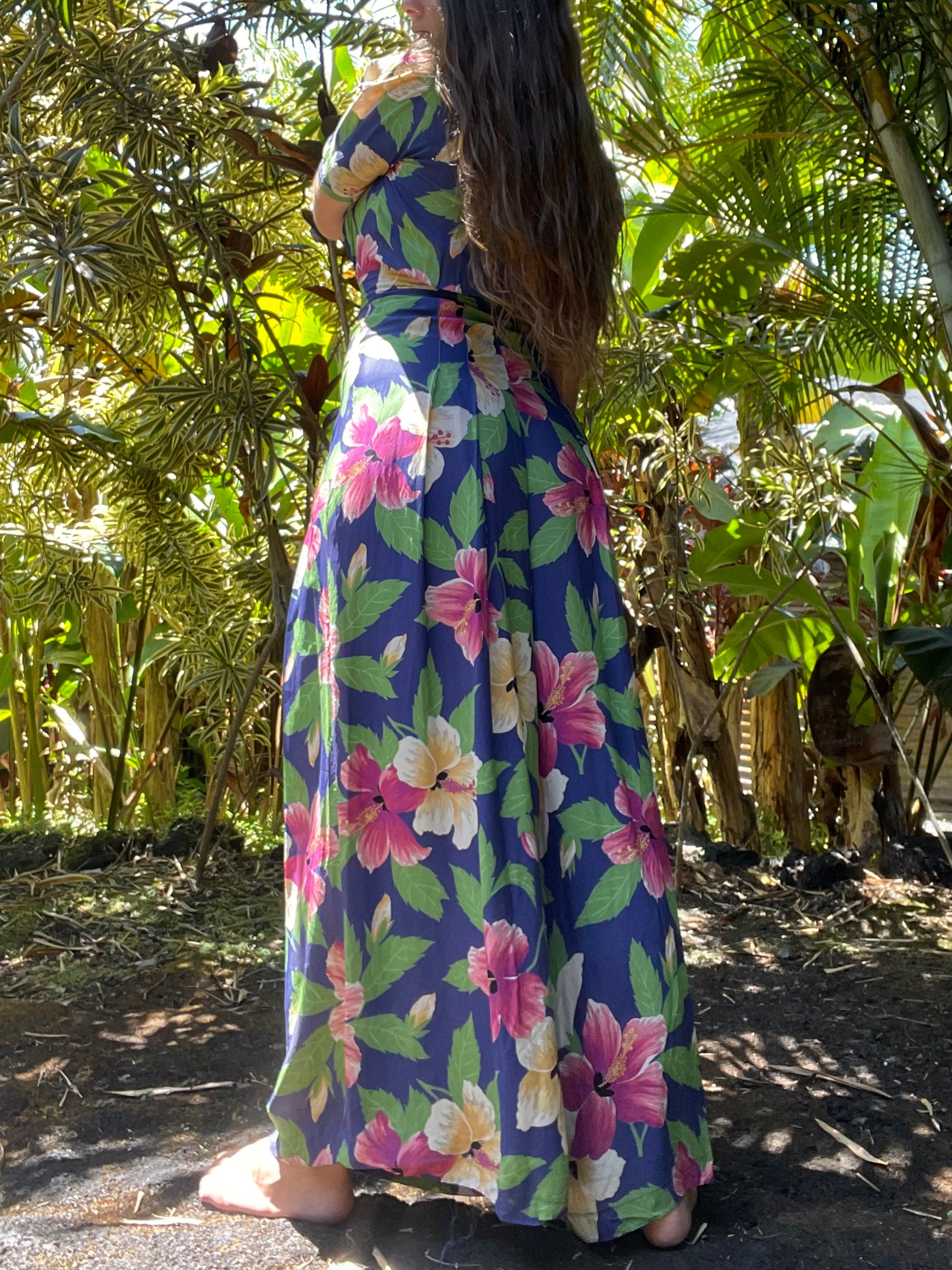 Incredibly special and covetable 1940s jumpsuit made from a large scale tropical Hawaiiana print rayon with a deep navy blue base color. Features slightly puffed sleeves, large early plastic button closures up bodice with talon bell zipper from waist down with hook and eye at waistline, darting down legs and attached self ties at waist to adjust to desired fit