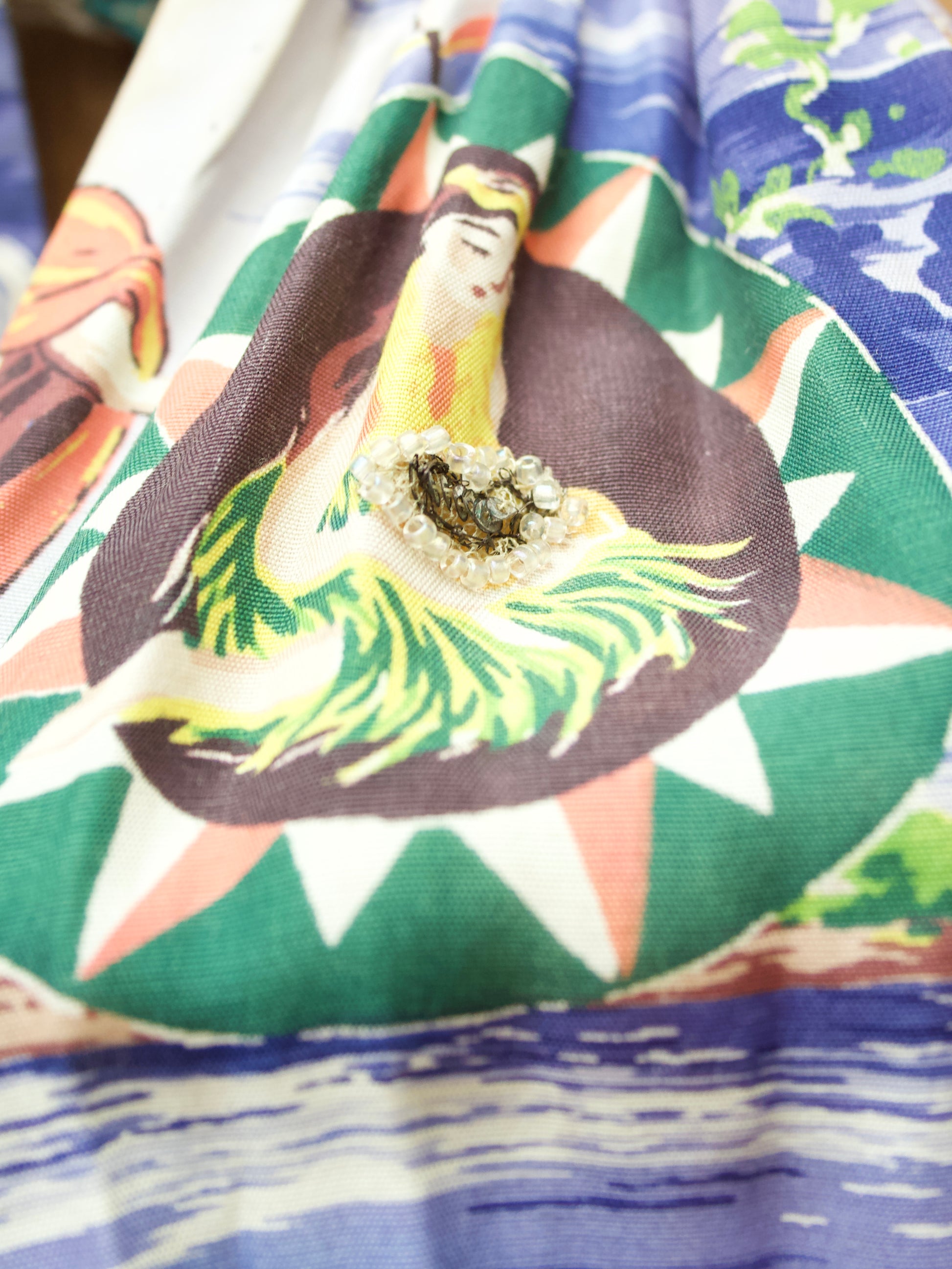 Special, one of a kind 1940s (possibly handmade) rayon Hawaiian printed halter with unique prong set rhinestone and hand beading embellishments scattered. Multiple hook and eye closures at back neck and on side of waistband.