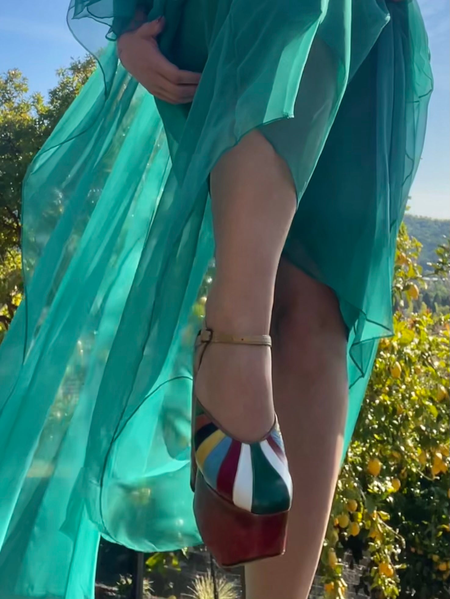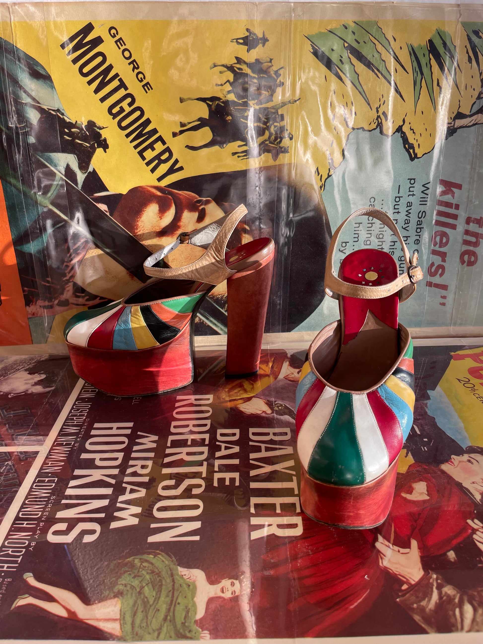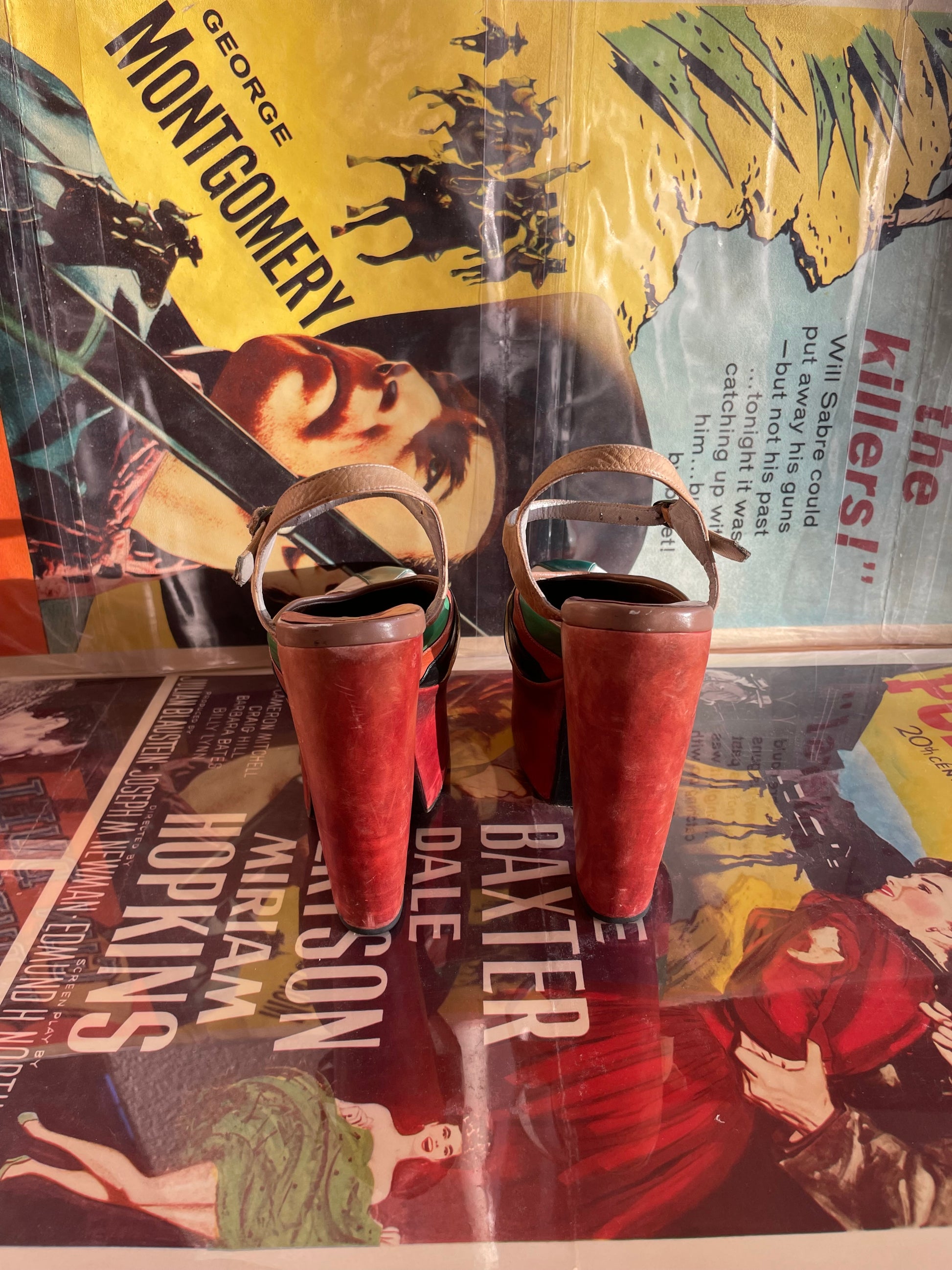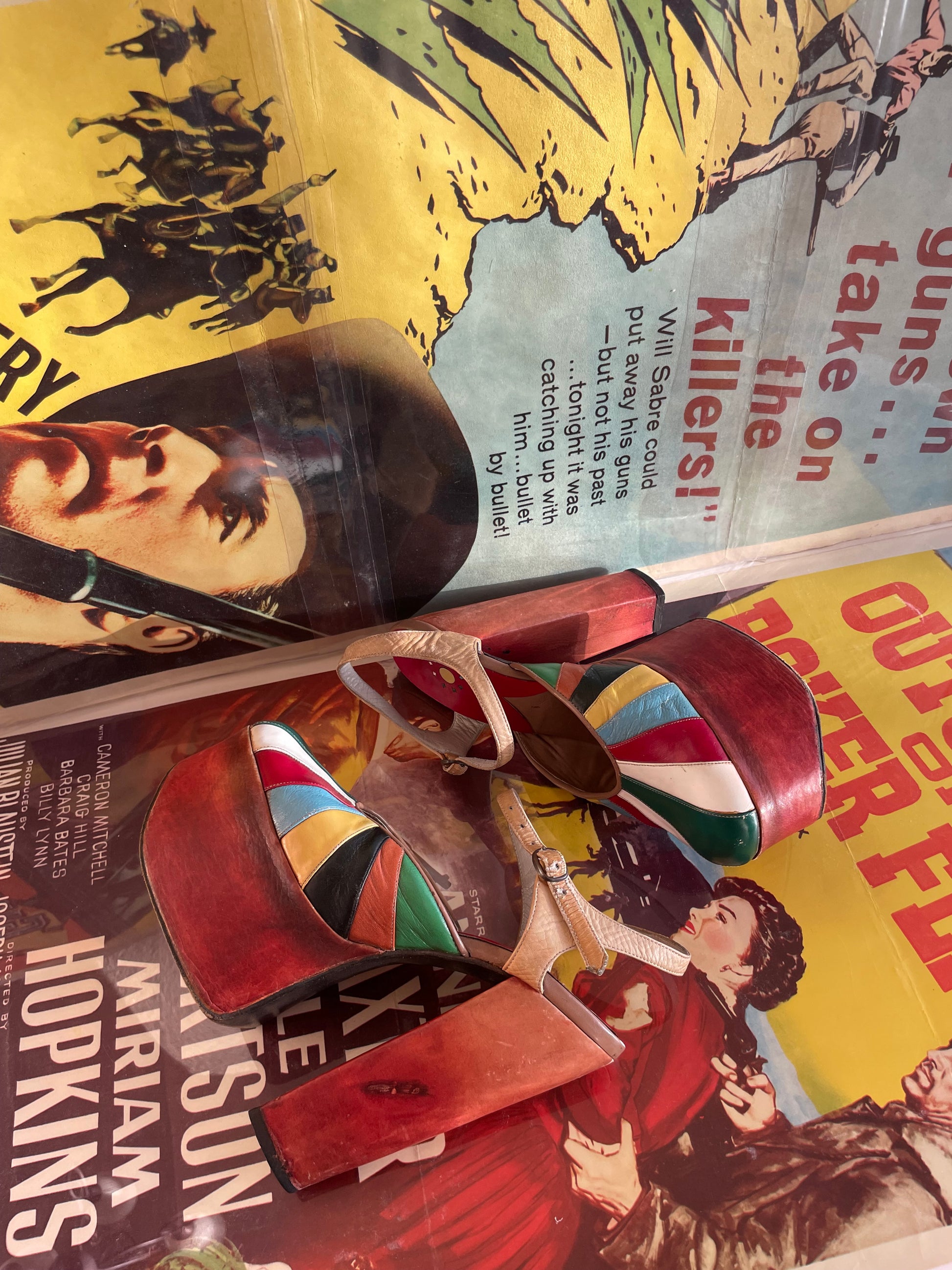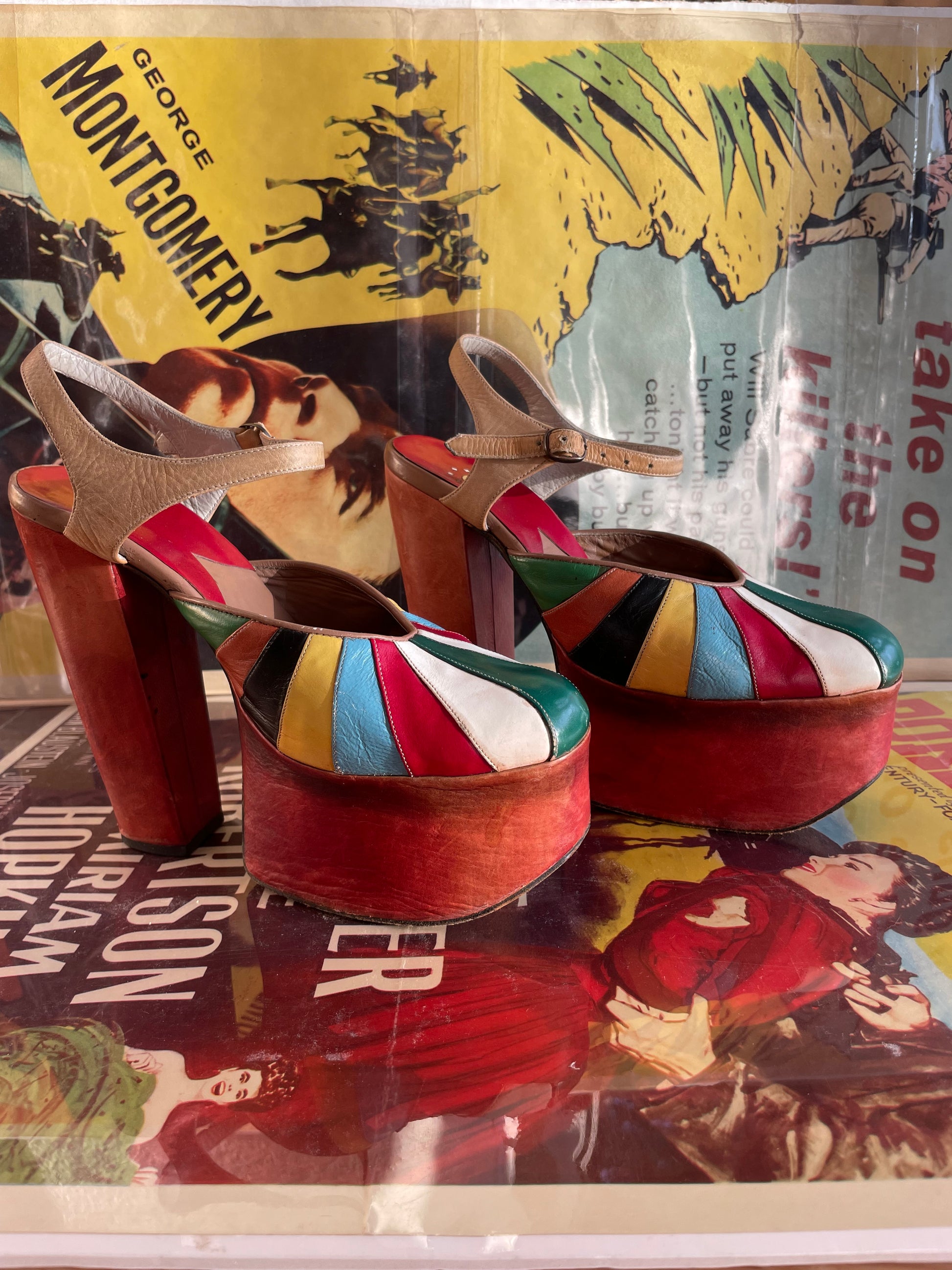 Iconic and special 1970s rainbow patched leather sky high platforms with ankle strap