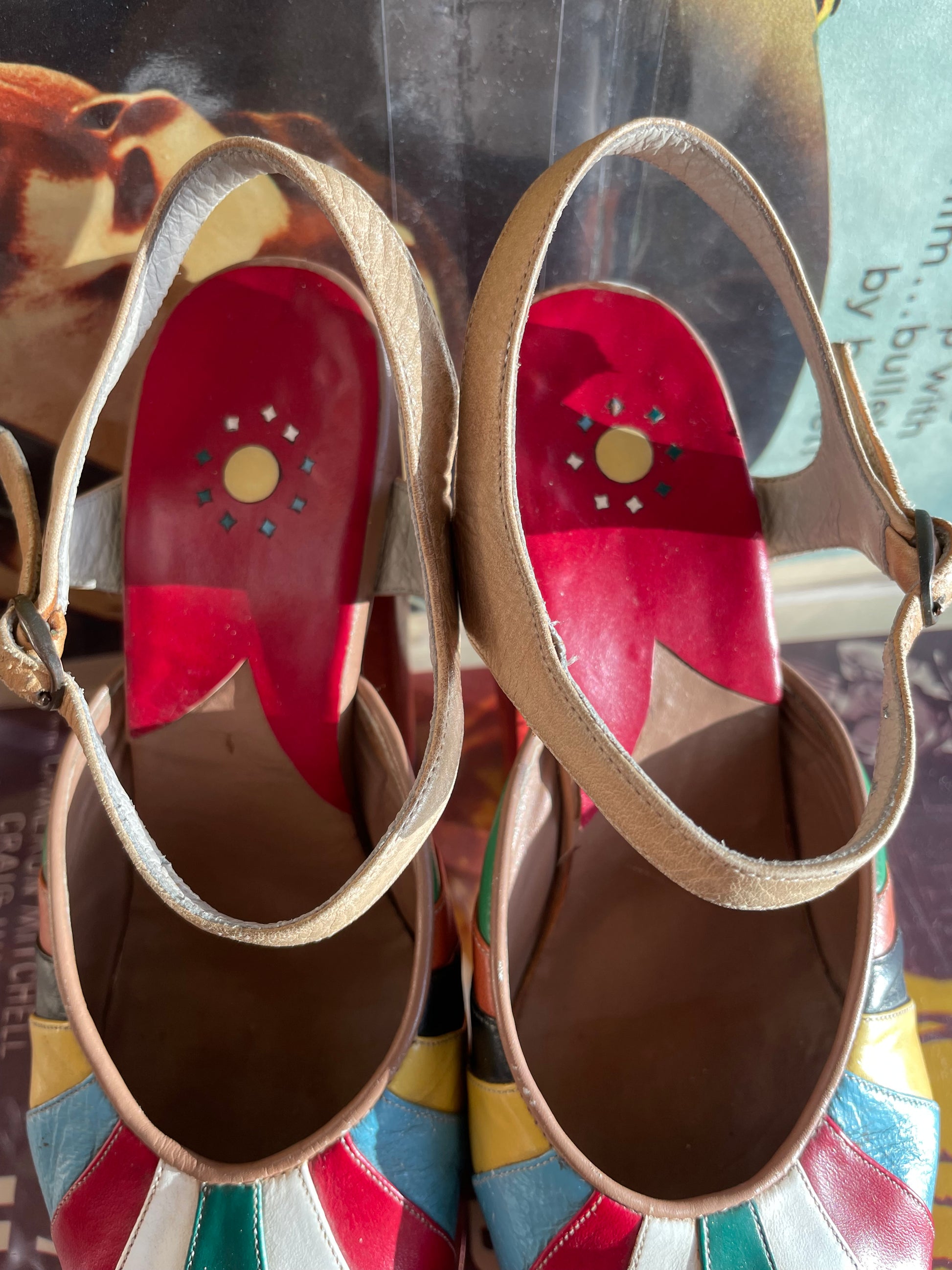 Condition: Great for age; in amazing shape with a mark on side of heel as shown, general wear to ankle strap near holes, but no tears. Small pin head size marks on colored leather on toes. Presents beautifully on