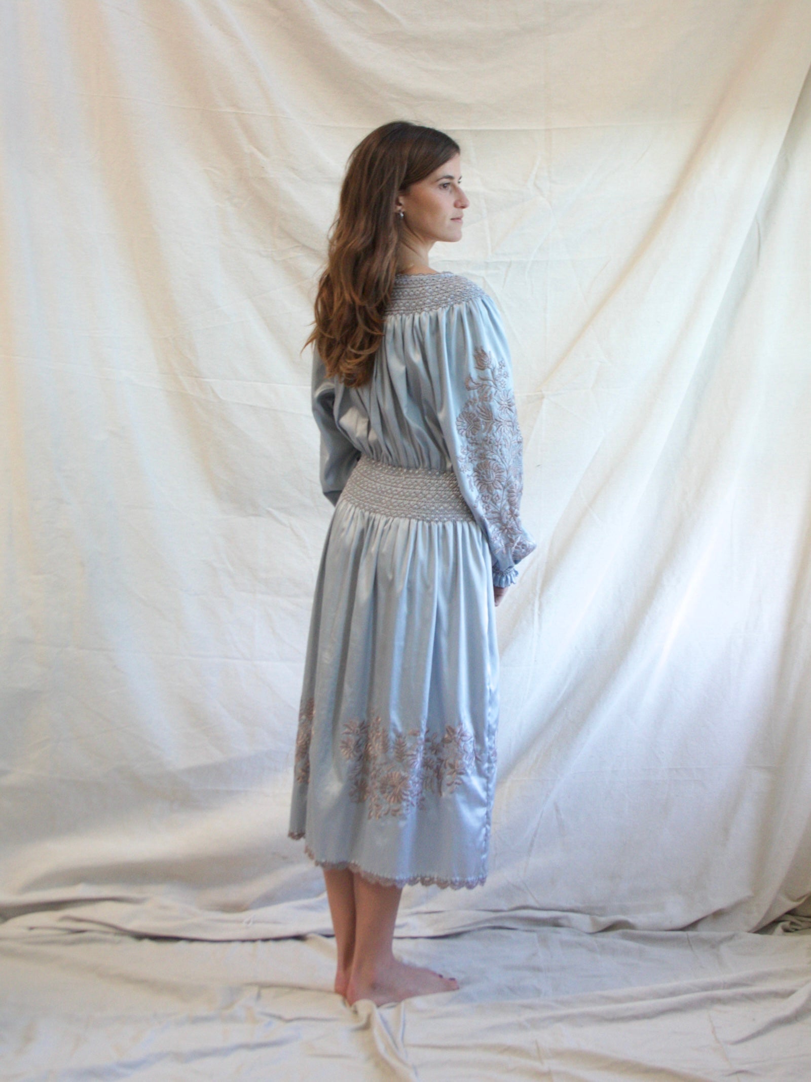 Vintage Icey Blue Silk Satin Hungarian Embroidered Peasant Dress